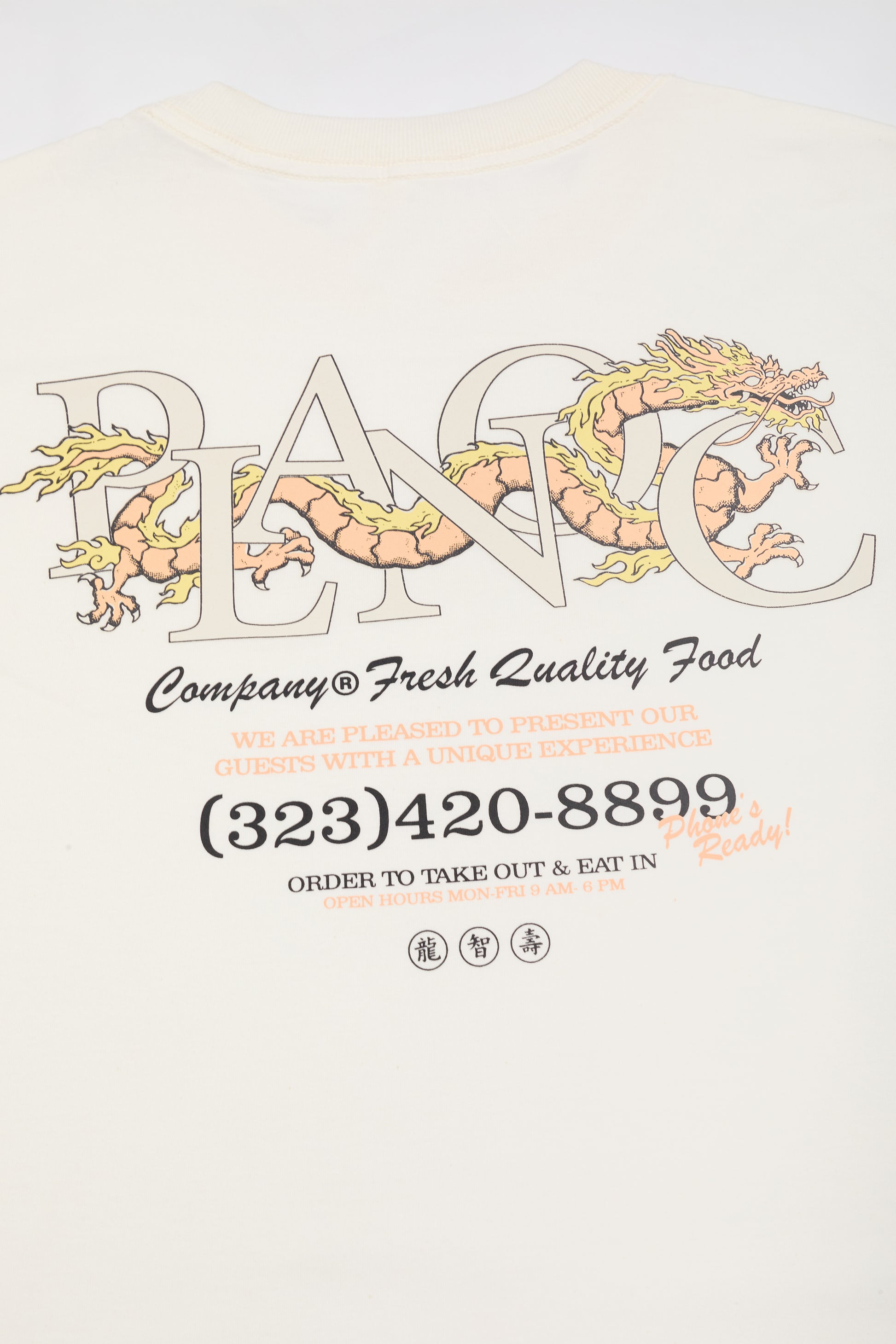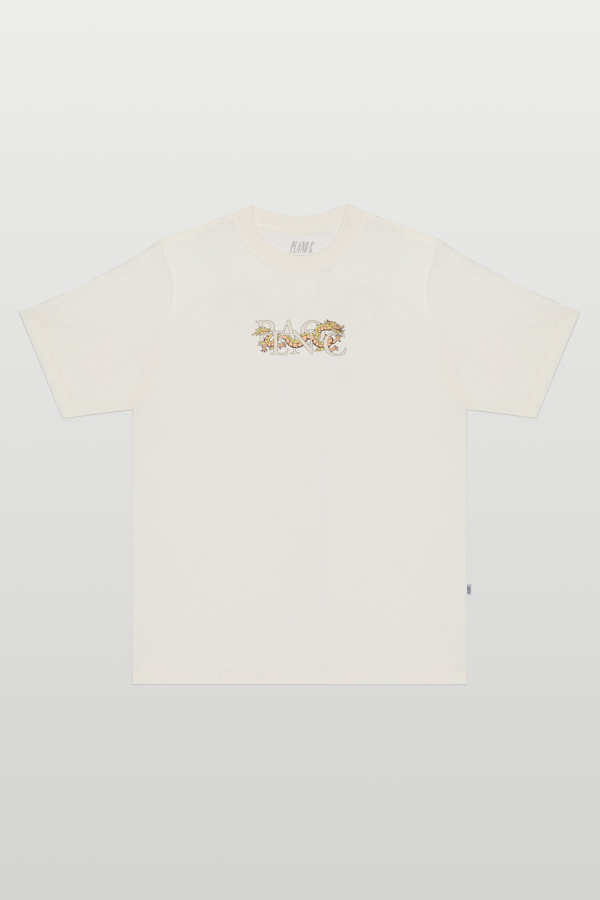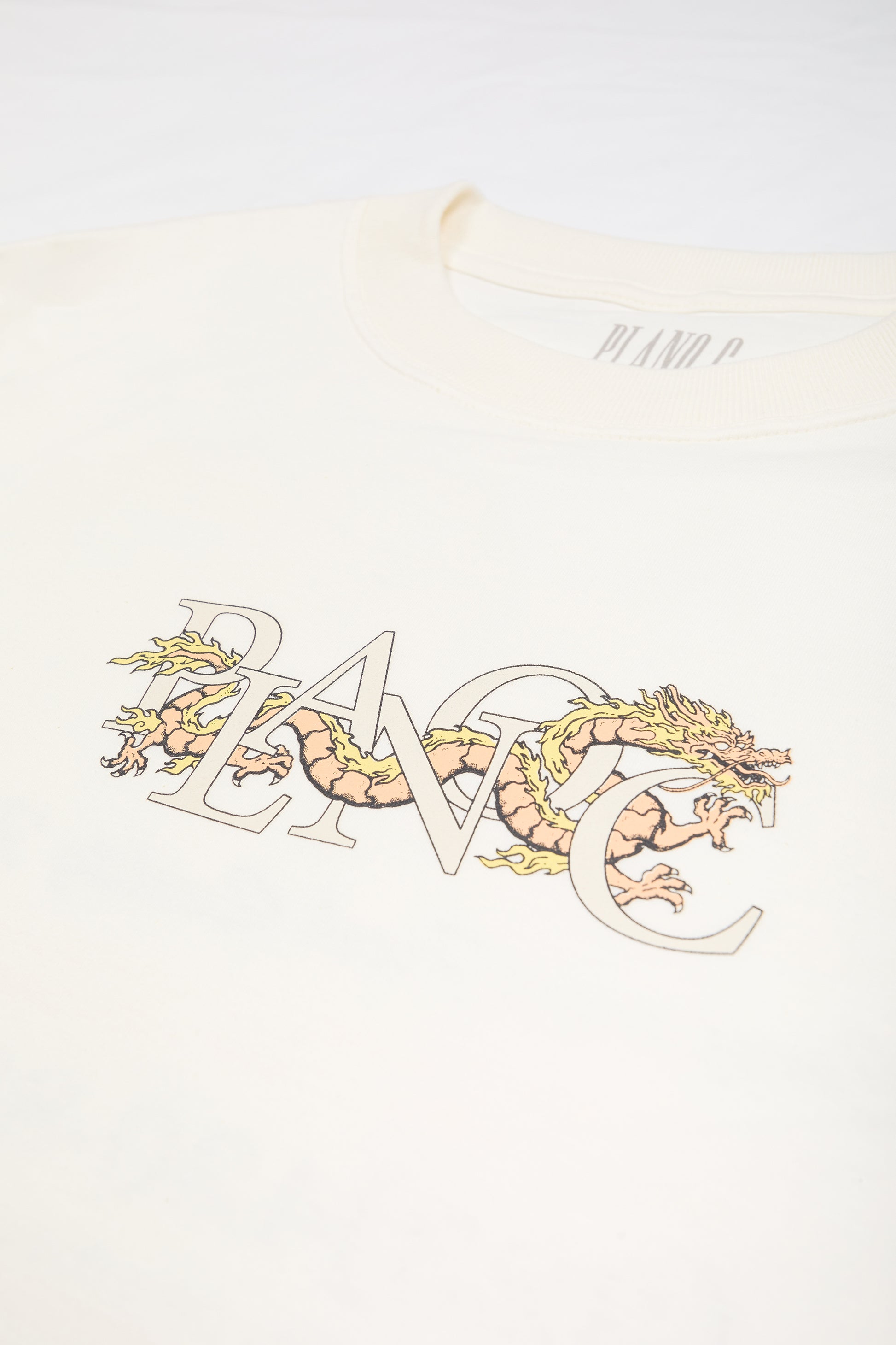 Estampa frontal com logotipo Plano C em composição gráfica de dragão. Nas costas, arte ampliada com tipografia clássica acompanhada de detalhes numéricos e símbolos, reforçando a identidade contemporânea da peça.