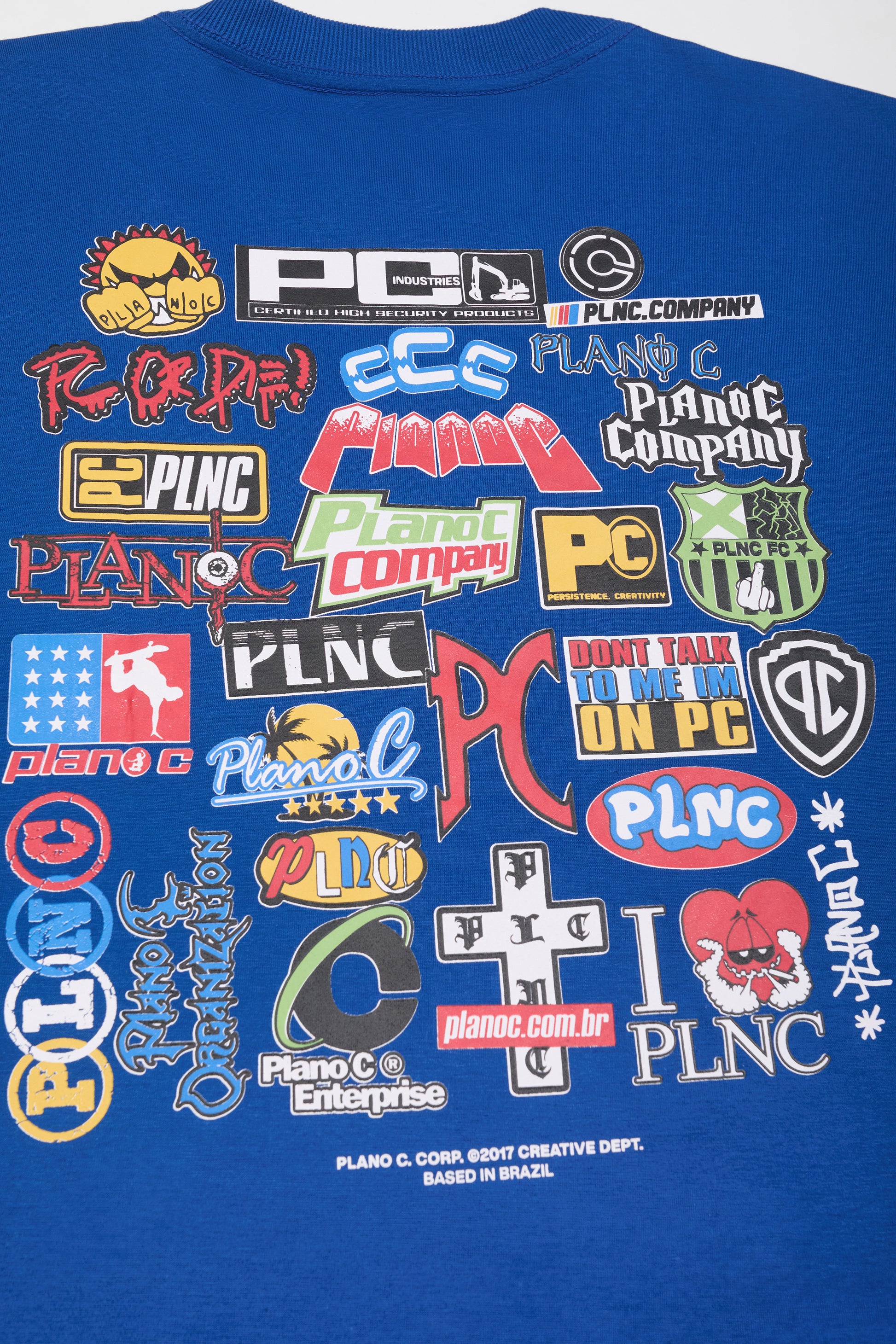 A estampa frontal apresenta o logotipo Plano C aplicado de forma minimalista, enquanto as costas exibem uma composição “stickerbomb” com uma colagem de selos, logos e ícones gráficos da marca.