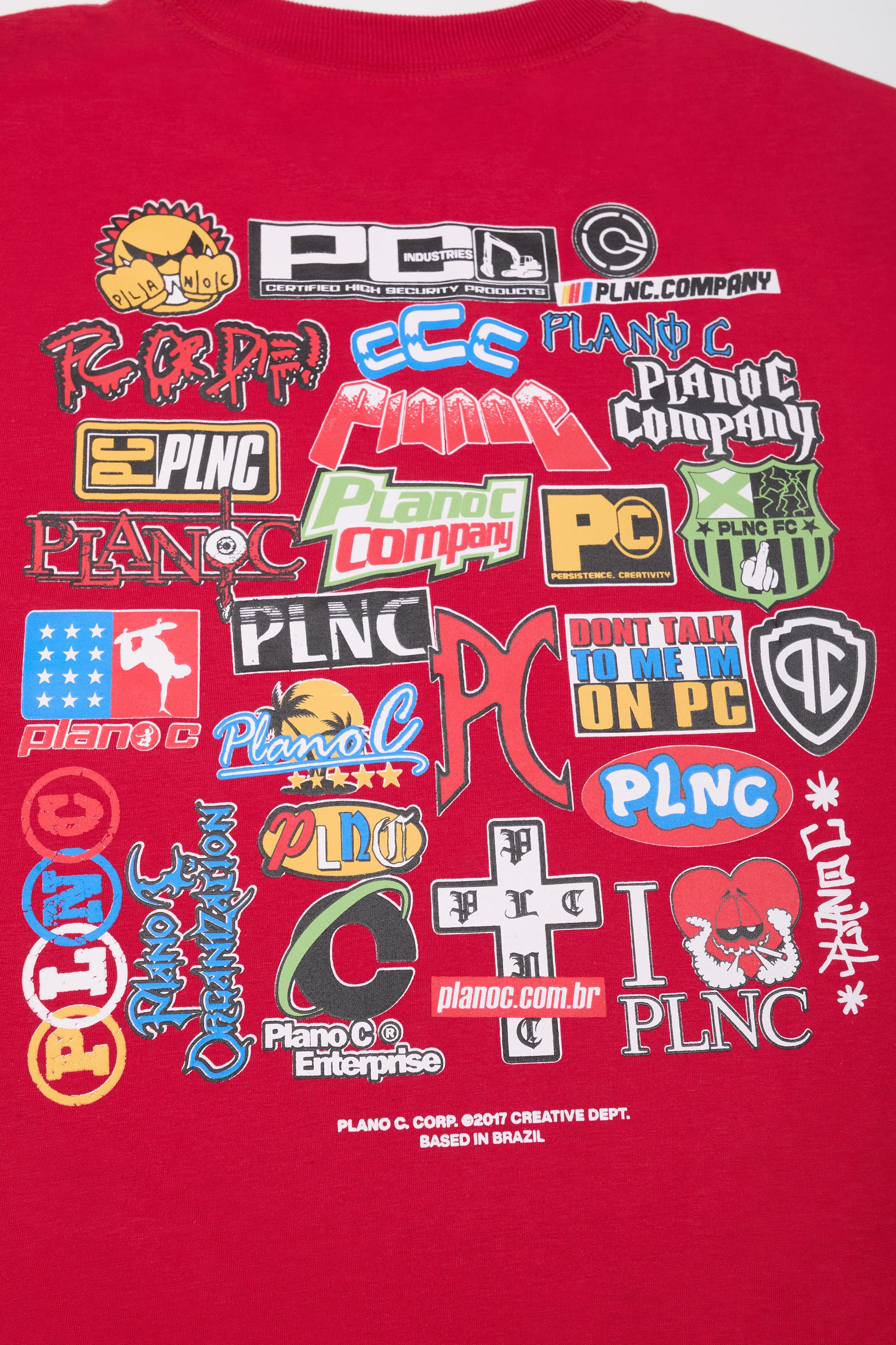 A estampa frontal apresenta o logotipo Plano C aplicado de forma minimalista, enquanto as costas exibem uma composição “stickerbomb” com uma colagem de selos, logos e ícones gráficos da marca.